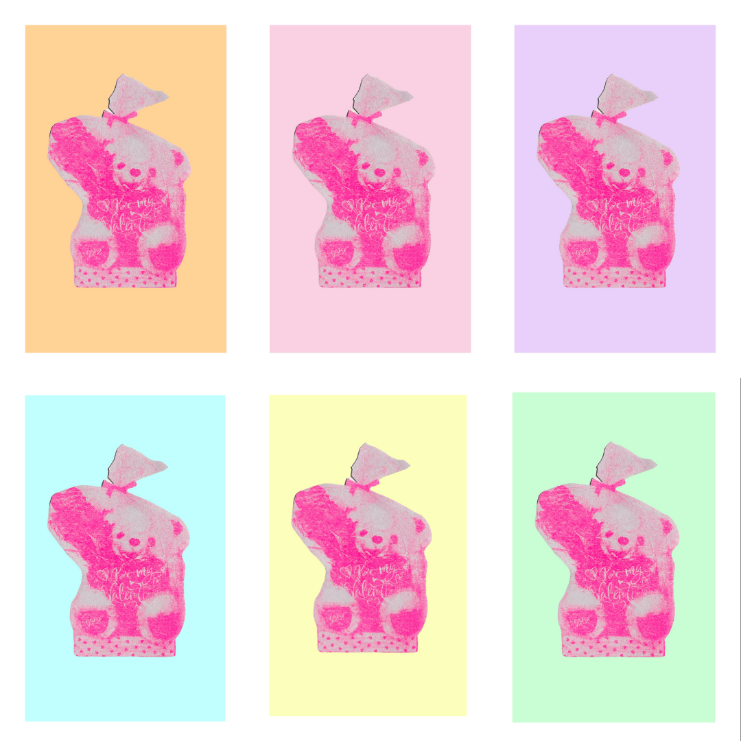 Osito de amor is inspired by Latinx street vendors and my parents who would hustle every Valentine's day as vendors in L.A. I put together this teddy bear, wrapped it up, and photographed it. The heart in the arrangement is from one of my parents' sidewalk sales. For 2022 it was done in collaboration with Pachanga Press.
